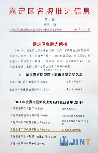 此次SD系列多功能鉆機再次被評為“上海名牌”產品,既是對公司多年來不懈努力的褒獎,更是對上海金泰的有力鼓舞,公司將一如既往地以“共筑堅實基礎、同創百年工程”經營理念,為國家和社會創造更多價值。