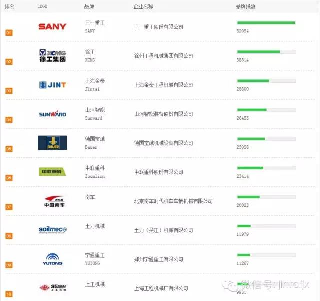 據(jù)悉,該榜單是通過在一定時期內(nèi)用戶對所有品牌、產(chǎn)品在線瀏覽及在線詢價(jià)統(tǒng)計(jì)的品牌指數(shù)排名而生成。此次中國路面機(jī)械網(wǎng)和工程機(jī)械電商網(wǎng)不僅發(fā)布了“中國工程機(jī)械品牌關(guān)注度TOP10”總榜單,同時還推出了囊括路面機(jī)械、土方機(jī)械、混凝土機(jī)械、起重機(jī)械、樁工機(jī)械、工業(yè)車輛等六大系列,涵蓋瀝青攪拌站、瀝青攤鋪機(jī)、壓實(shí)機(jī)械、養(yǎng)護(hù)機(jī)械、挖掘機(jī)、裝載機(jī)、混凝土攪拌站、攪拌運(yùn)輸車、工程起重機(jī)等熱門產(chǎn)品共計(jì)17大榜單。