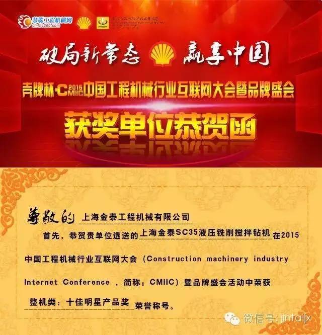 日前,由中國工程機械工業協會、長沙經濟技術開發區、慧聰工程機械網等機構聯合參與并舉辦的“CMIC2015中國工程機械行業互聯網大會暨品牌盛會”系列活動之“2015年工程機械明星產品”評選結果“鳴鑼定音”,上海金泰SC35雙輪攪拌鉆機榮獲整機類“十佳明星產品”獎。