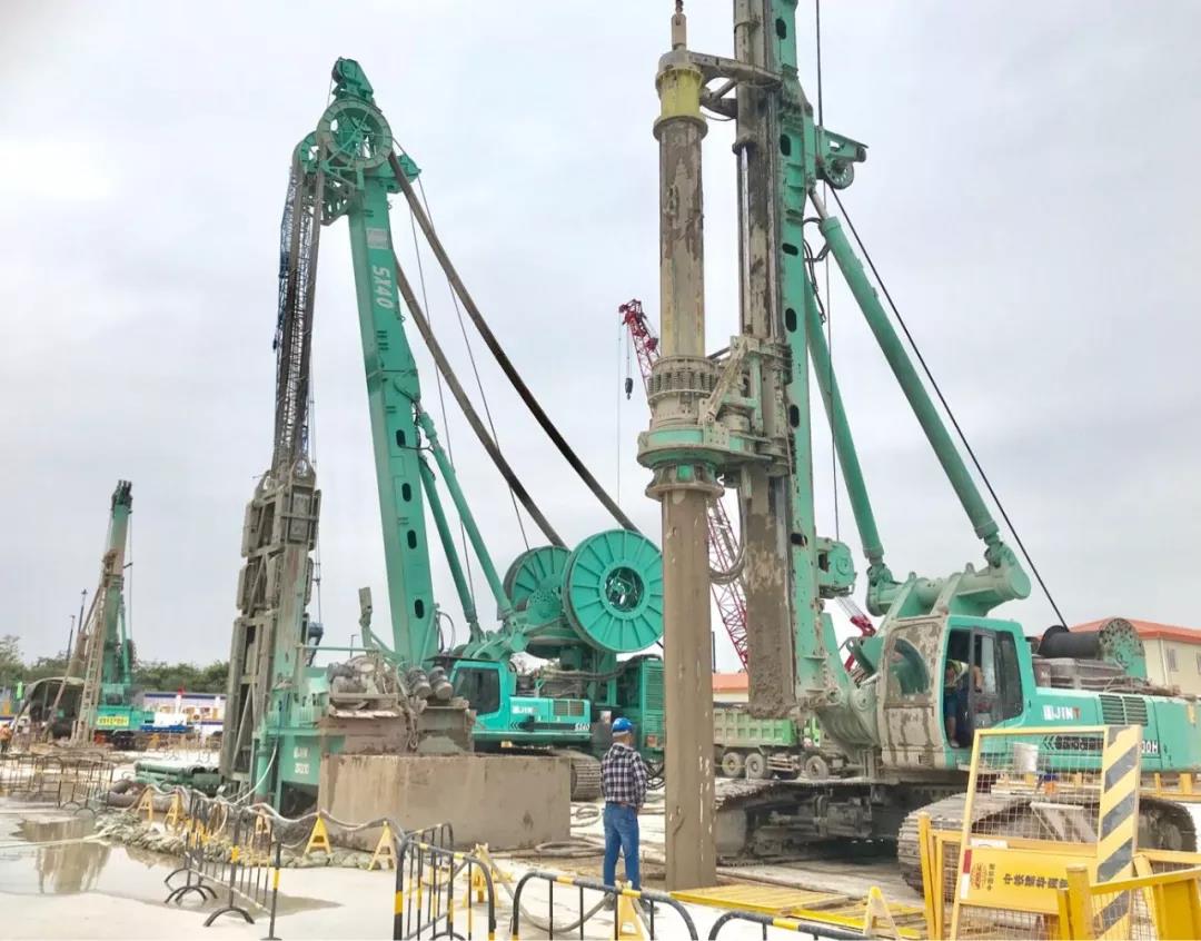 圖為2018年4月廣州地鐵十八和二十二號線橫瀝站5號井工地,金泰SX40-A、SH30H、SG60A三大主力機型組合接力施工現(xiàn)場