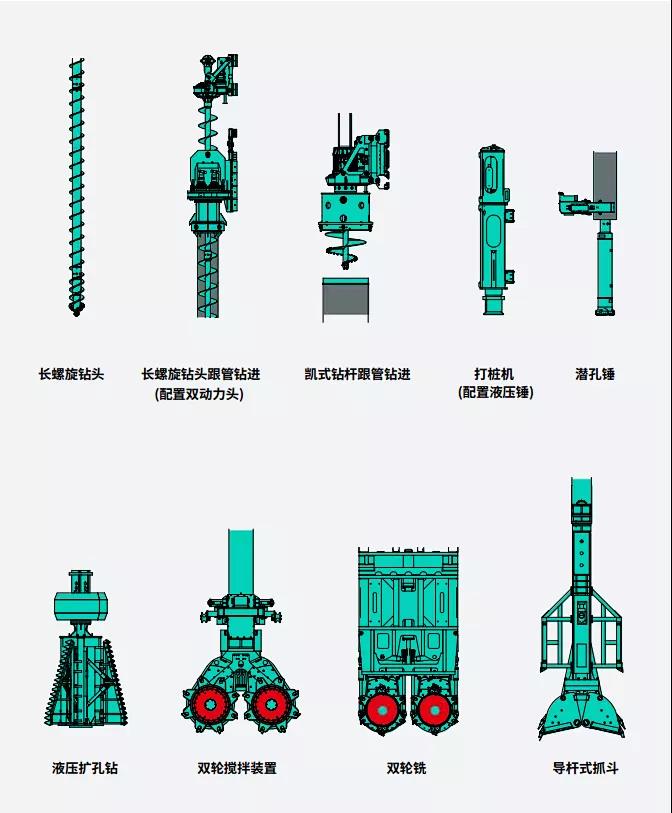 上海金泰注于地下施工設(shè)備研發(fā)制造60余載,旋挖鉆機(jī)的多功能特點(diǎn)堪稱行業(yè)典范。旋挖主機(jī)已成功可搭載雙輪攪、長螺旋、全套管跟管、液壓錘、潛孔錘、雙輪銑、導(dǎo)桿抓斗等多種工法裝備并得到應(yīng)用驗(yàn)證。
